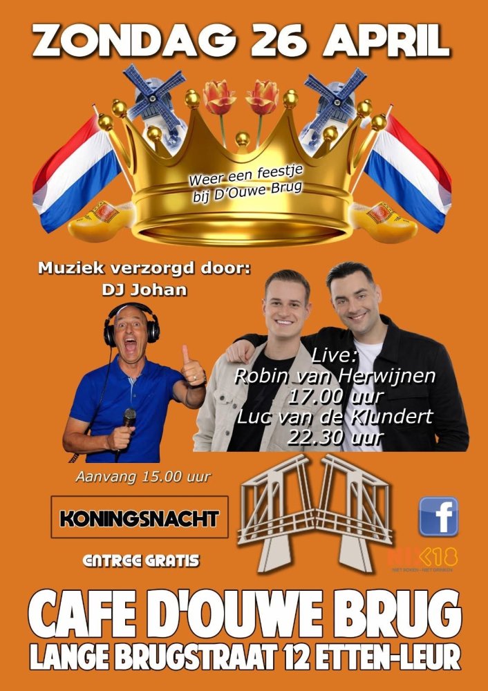 Op zondag 26 april is café d'Ouwe Brug vanaf 15.00 uur geopend voor Koningsnacht. DJ Johan verzorgt de muziek.