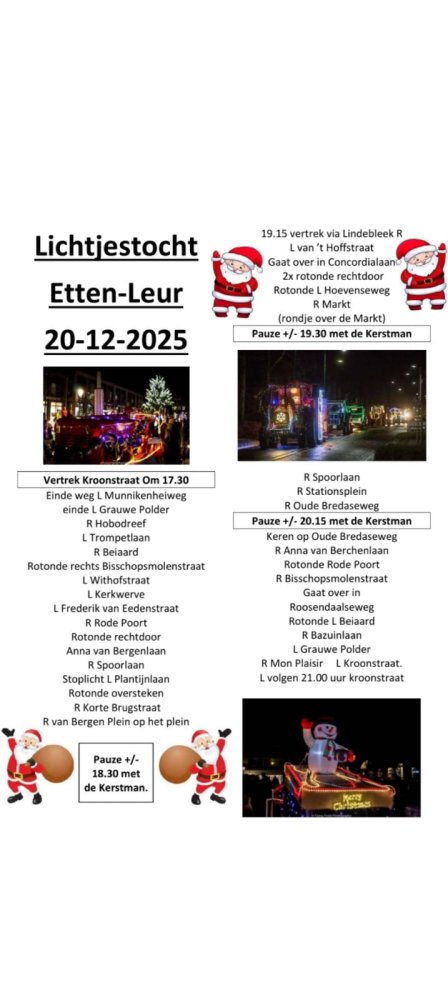 Zaterdag 19 december voert er weer een prachtig verlichte optocht door Etten-Leur. Lees verder