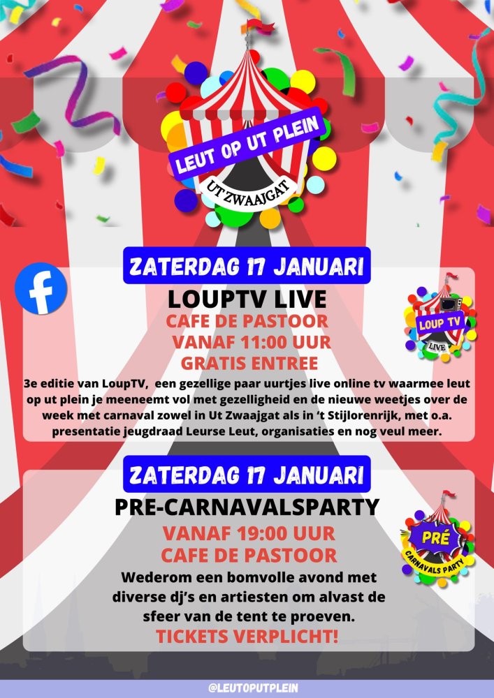 Op 17 januari vindt bij De Pastoor de Pre-Carnavalsparty voor Leut op ut plein plaats. Het begint om 19.00 uur.