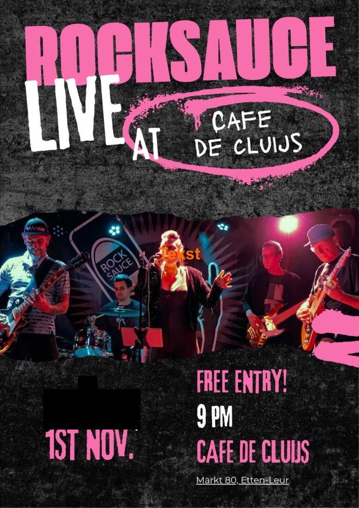 Zaterdagavond 1 november speelt de band Rock Sauce live in De Cluijs op de Markt in Etten-Leur.